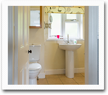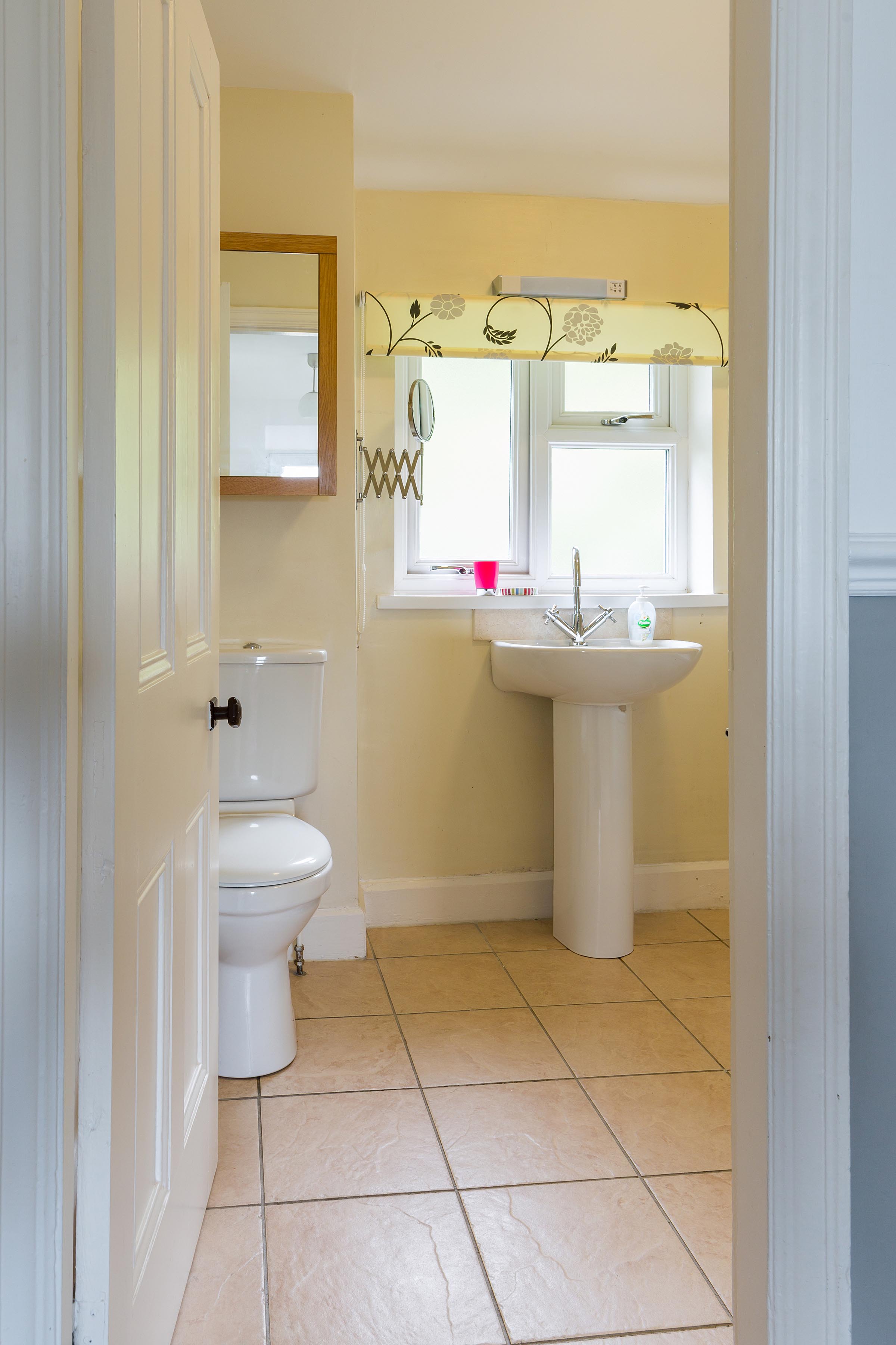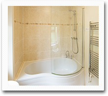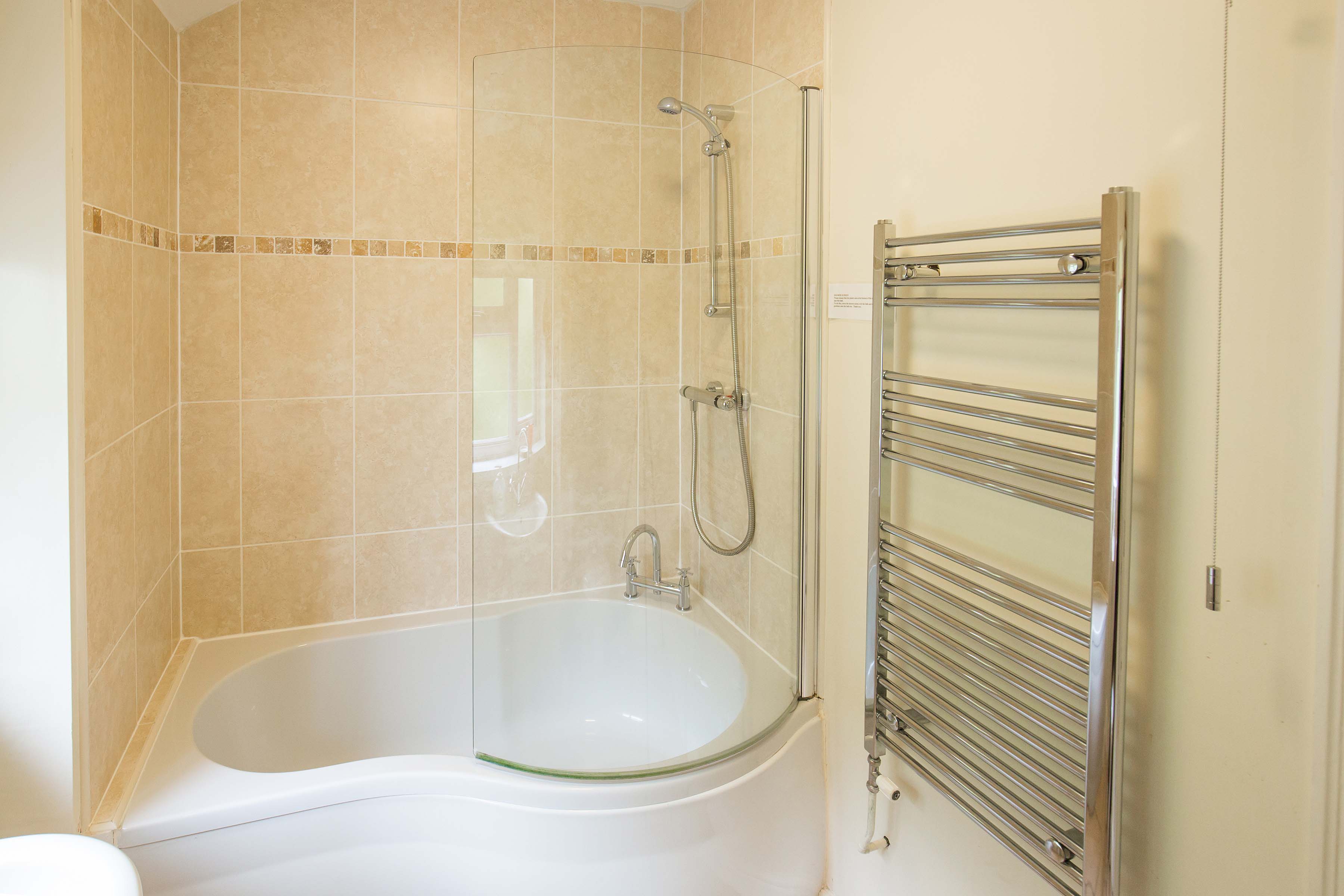 A P-shaped bath with shower and shower screen, a basin, a WC and a towel radiator are provided.