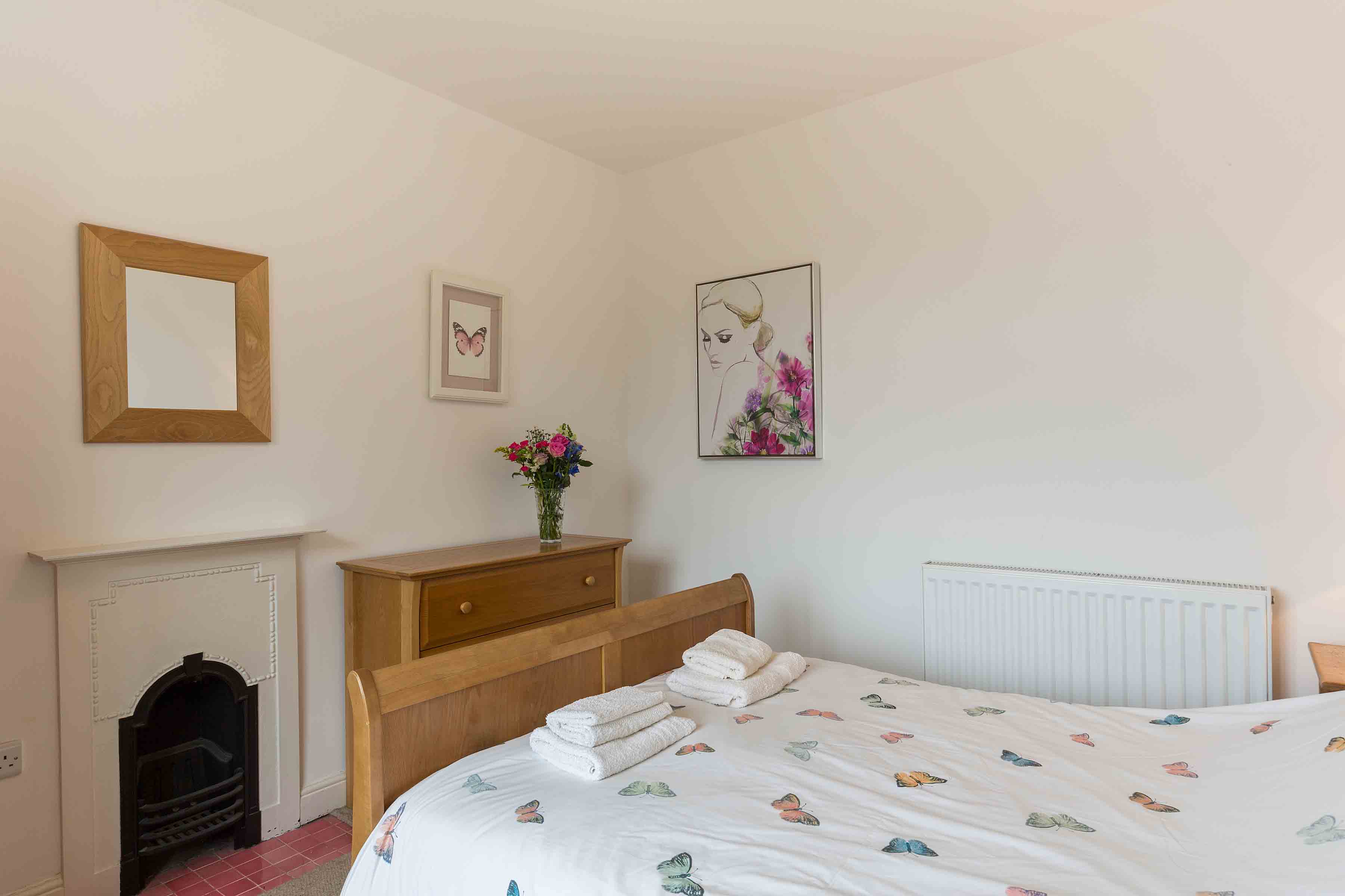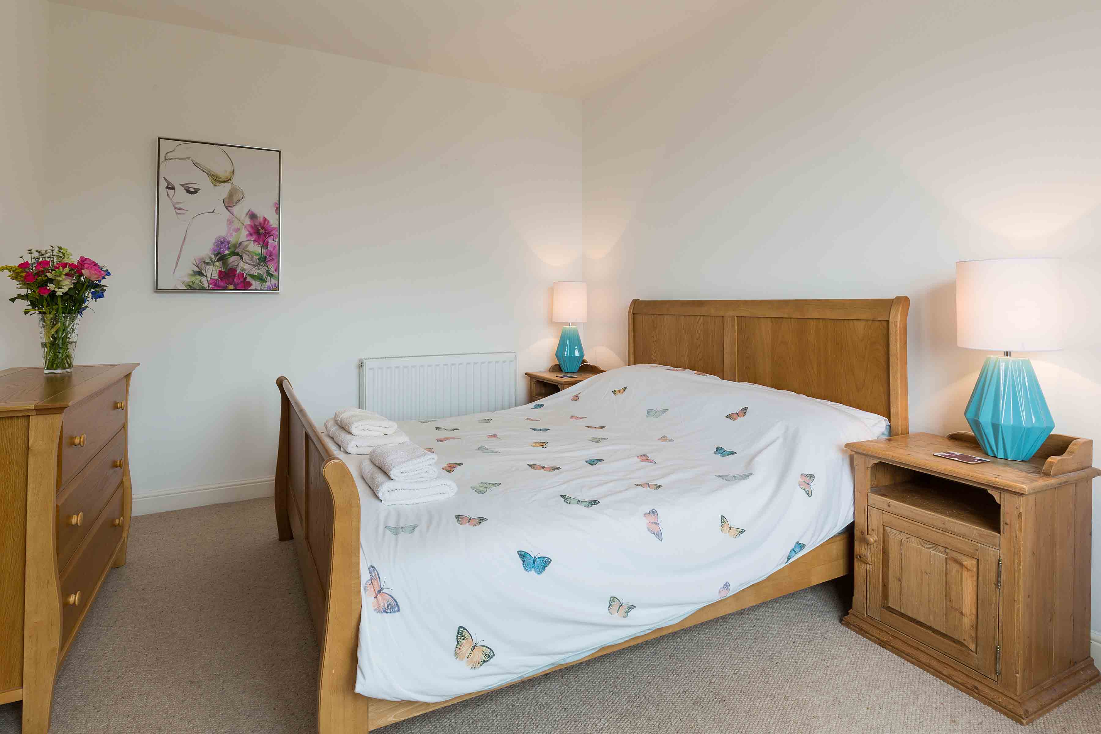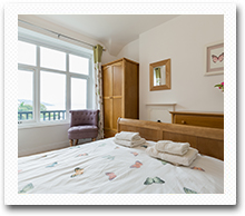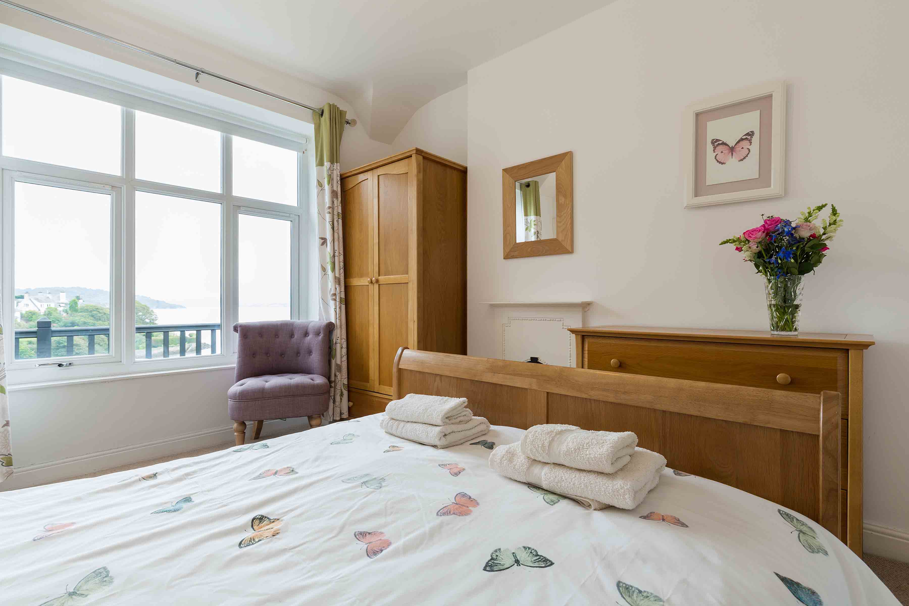 A double bed, wardrobe, chest of drawers and two bedside tables are provided. The double bedroom enjoys spectacular sea and mountain views.